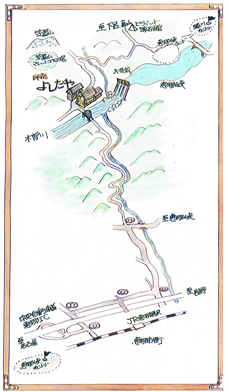 名古屋(JR中央本線)→JR恵那駅→タクシーで10分 1時間車/名古屋IC(東名高速道路)→小牧JCT(中央自動車道)→恵那IC→車で10分 約50分